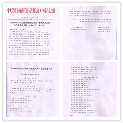 我公司——山東興田陽光智能裝備股份有限公司,因在新冠肺炎疫情防控工作中表現突出,被槐蔭區玉清湖街道評為“新冠肺炎疫情防控工作表現突出的先進集體”,并被授予“抗‘疫’先鋒團隊”榮譽稱號。